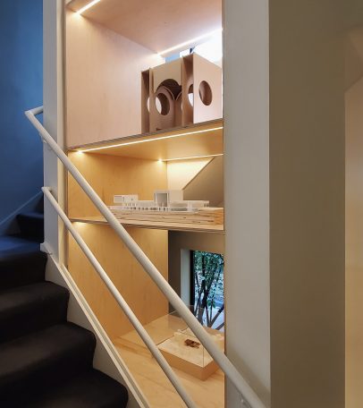 Our team has completed a custom renovation of our back stair, designing and implementing a plywood shelving system to create an illuminated display for our physical models, bringing more of our work and design process into our daily life at the office.