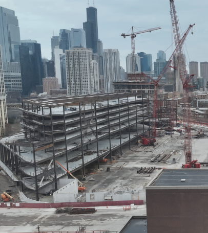 The outline of the future Bally’s Chicago Casino gains significant definition as the erection of the primary steel structure nears completion.